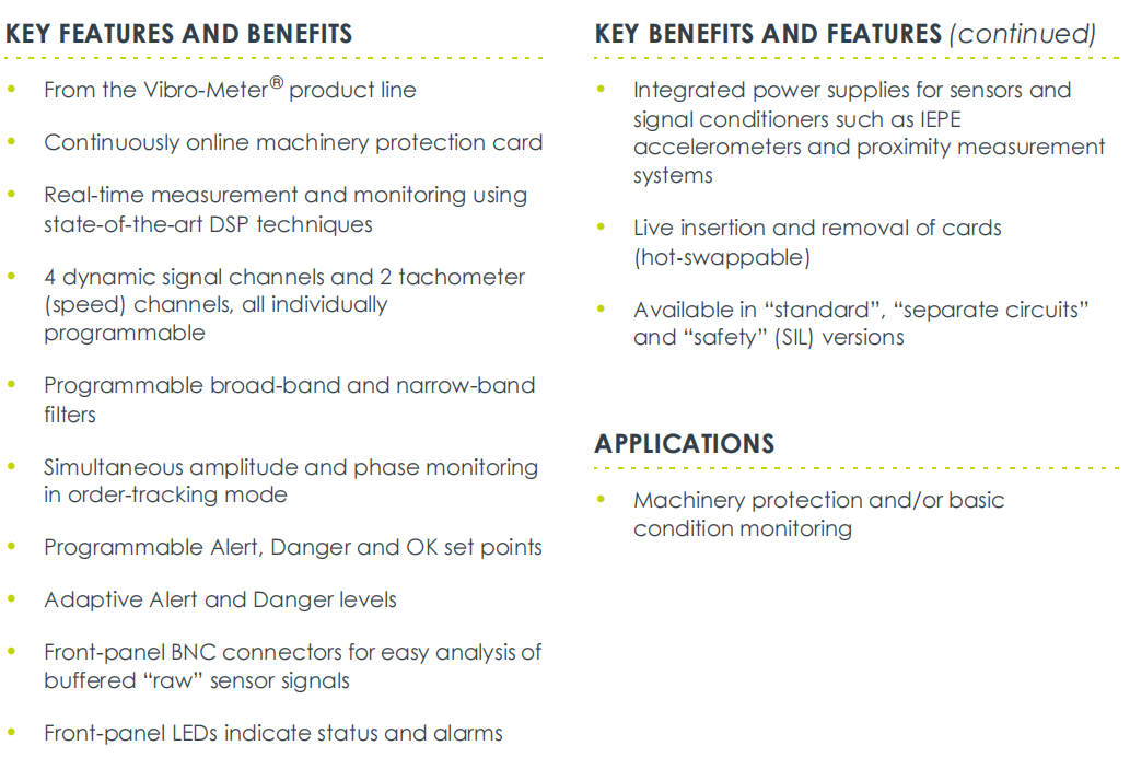 MPC4의 이 "표준" 버전은 4개 채널의 동적 진동/변위 신호와 2개 채널의 회전 속도(속도) 신호를 동시에 처리할 수 있는 다기능 및 완전한 기능을 갖춘 카드입니다. MPC4 200-510-070-112 설계는 기계를 안정적으로 보호하여 과도한 진동, 변위 또는 속도로 인한 잠재적인 손상을 방지합니다.