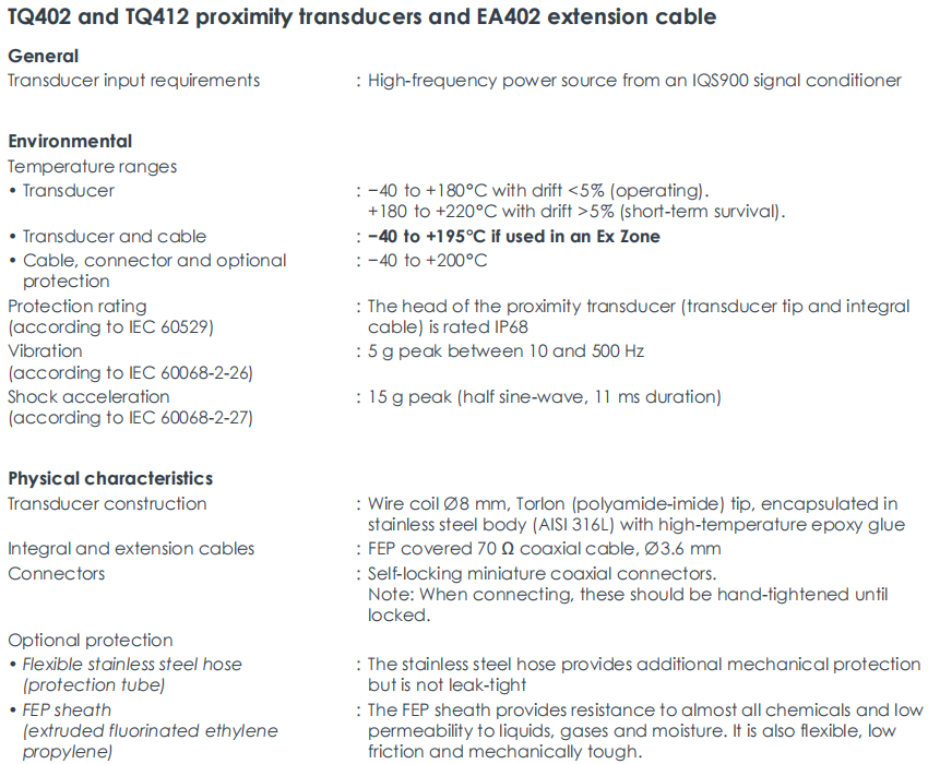 TQ412 111-412-000-013-A1-B1-E050-F2-G050-H05는 Parker Meggitt에서 생산한 고성능 비접촉 와전류 변위 센서입니다. TQ412 제품은 정밀 측정 시스템 제품 라인에 속하며 열악한 산업 환경에서 회전하는 기계 샤프트의 상대 진동과 축 변위를 정밀하게 측정하기 위해 특별히 설계되었습니다.